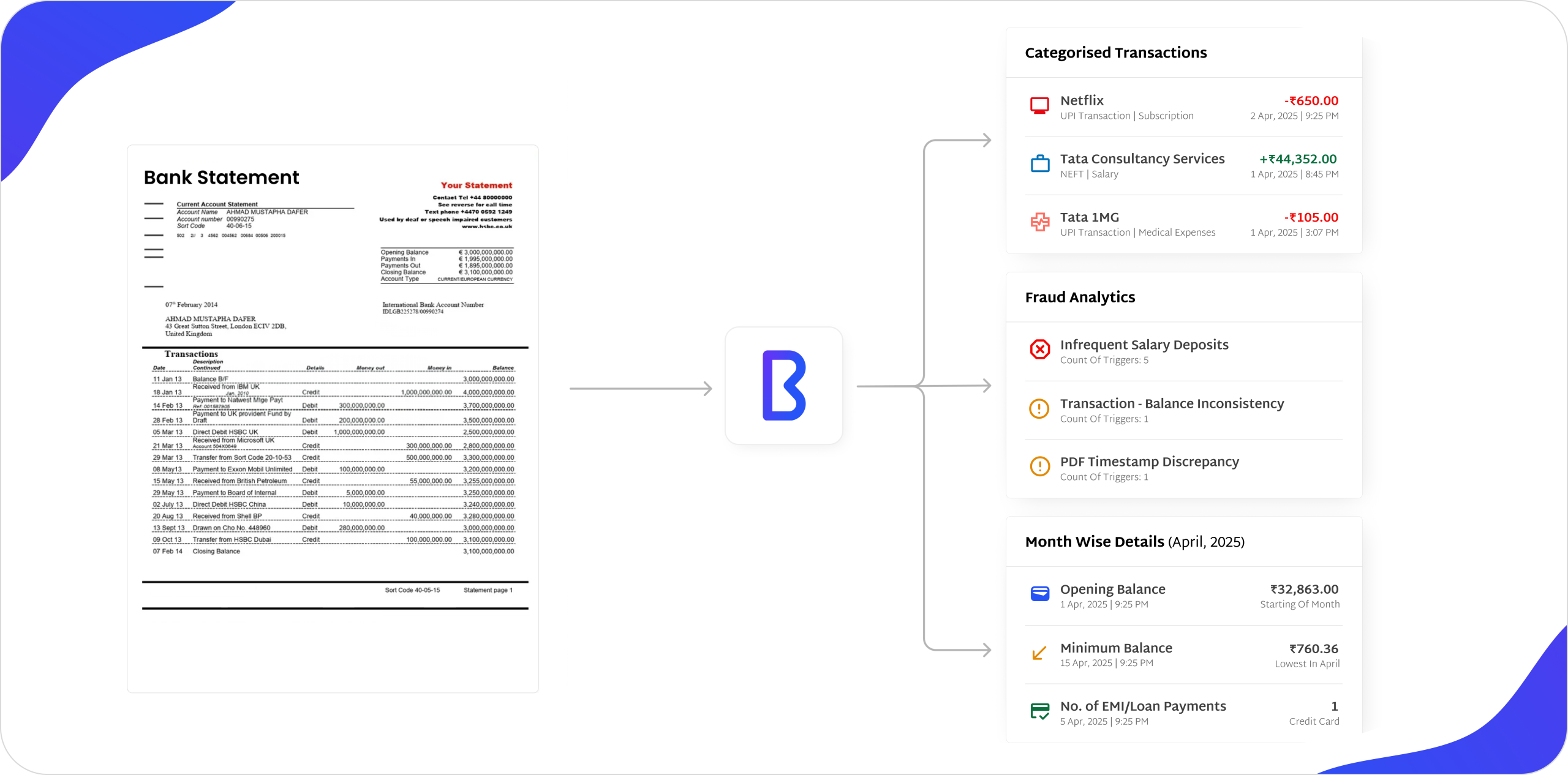Time-consuming and error-prone manual extraction, standardization & interpretation of data from inconsistent statement formats & high transaction volumes.